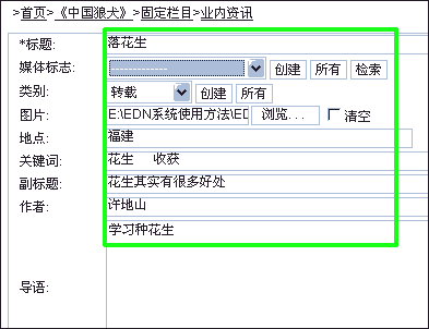 網(wǎng)站吸引瀏覽者的一個重要途徑就是其內(nèi)容的更新速度,而EDN系統(tǒng)的好處就在于它具有方便快捷的內(nèi)容添加方式。下面的步驟將把這個過程一一剖析,讀完這篇文章,相信您一定能夠自如地添加您想展示的任何內(nèi)容。在看這篇文章的過程中,請注意綠色方框和綠色文字,這些是操作過程的生動體現(xiàn)。例如,向頁面添加一篇文章《落花生》。