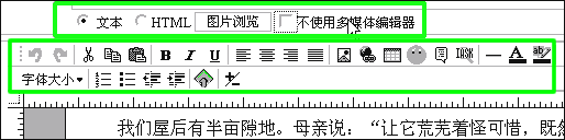 6.先演示使用媒體編輯器的情況。在不勾選“不使用多媒體編輯器”時,就是使用媒體編輯器,這時的編輯是可視化的,只要按照我們平常在Microsoft office word中寫出來的結構原樣粘貼,上傳以后的頁面也會如此排列。這種方式比較簡單、明了,所見即所得,適合HTML基礎薄弱的用戶,但缺點是對圖片文字位置的控制能力較差,產(chǎn)生很多垃圾代碼,占用資源也很大。文字編輯功能同我們?nèi)粘J褂玫腗icrosoft office word幾乎是一樣的,可以進行字號、大小、顏色等修改。編輯器下面的“加號”和“減號”可以使編輯窗口擴大或縮小,有利于編輯的方便。
