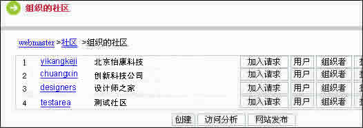 2. 管理社區(qū)基本功能:點(diǎn)擊社區(qū)名稱,便可以進(jìn)入這個(gè)網(wǎng)站;加入請求用來審核新建的社區(qū)是否通過;用戶功能可創(chuàng)建,編輯、刪除網(wǎng)站會(huì)員;組織者功能可創(chuàng)建、編輯、刪除網(wǎng)站組織者。