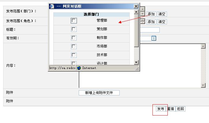 點(diǎn)擊了公告管理,我們就可以現(xiàn)來(lái)創(chuàng)建一個(gè)新的公告了,點(diǎn)擊“新建公告通知”按鈕,會(huì)彈出一個(gè)新建公告的頁(yè)面,在選擇發(fā)布部門(mén)時(shí),點(diǎn)擊后面的“添加”就可以選擇發(fā)布公告通知的部門(mén)范圍了,如圖: