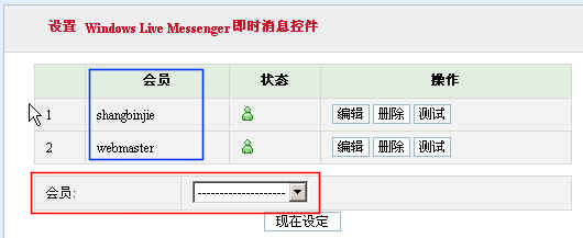 蘭色框里的是已設定MSN的會員。紅色框里的下拉框是選擇未設定MSN的已有會員。選擇會員,點擊現(xiàn)在設定,操作步驟與“設定個人MSN”相同。