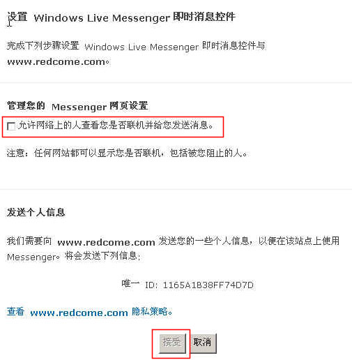 點擊“個人客服MSN配置”進入“設置 Windows Live Messenge即時消息控件”頁面;如圖: