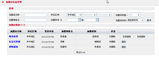 可以按加盟店名稱、法人、加盟店類型或級別、營業(yè)電話經行信息的查詢。