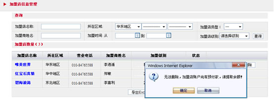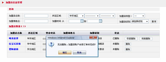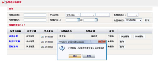 點擊刪除按鈕,如果此加盟店有聯(lián)系人尚未刪除或與加盟店關聯(lián)此加盟店不可以被刪除。如下圖。