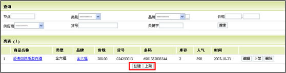 商品管理員通過輸入節(jié)點、類別、品牌、價格、供應商、貨號、商品名稱等關鍵字之一,可以實現相關商品的搜索。創(chuàng)建商品。