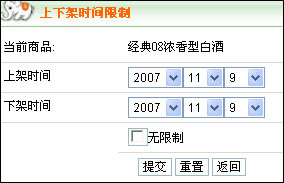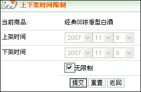 點列表中某一商品所對應的“上架”,可使該商品向顧客開放,顯示在前臺頁面。管理員可在“上下架時間限制”頁面看到當前商品,并選擇“上架時間”和“下架時間”,商品到期會自動下架。一般情況下,管理員可以勾選“無限制”,這樣商品就永遠也不會下架。如果用戶需要讓商品下架,可以不勾選“無限制”,并在“下架時間”輸入當天的日期即可。
