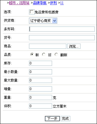 點“高級”,進入產品的可視化編輯頁面,點“完成”則表示該商品屬性填寫完畢并提交。點“下一步”,進入商品貨號、庫存等信息的編輯頁面。填加信息完畢,點“下一步”,