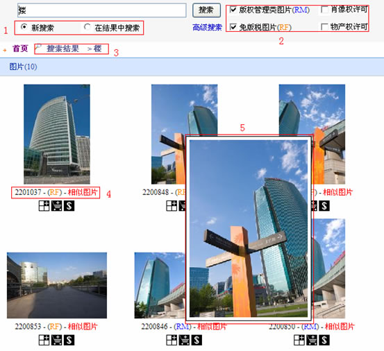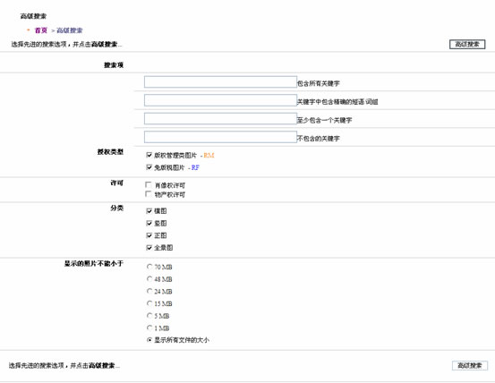 1、 基本搜索:可根據(jù)圖片的編號、攝影師、關(guān)鍵字、標題進行匹配搜索,還可以按照版權(quán)類別(RM/RF)或肖像權(quán)和物產(chǎn)權(quán)來進行分類搜索