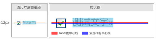 如果按照之前的設(shè)想,紅藍(lán)兩線應(yīng)該是重合的。但現(xiàn)在的情況是,它們相差了1px。并且這1px是沒(méi)有規(guī)律的,隨著字號(hào)的放大,并不恒定,貌似輕易也無(wú)法提煉出對(duì)應(yīng)關(guān)系來(lái)。于是想到,再試一下將label也加上vertical-align:middle。結(jié)果如圖: