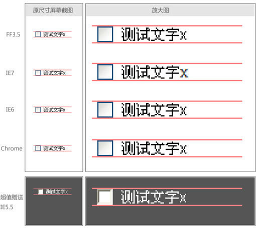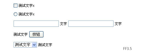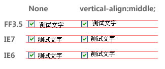 但是這對(duì)于中文來(lái)說(shuō),并不是一個(gè)好的結(jié)果。因?yàn)橹形氖欠綁K字,并且相同字號(hào)的情況下,高度會(huì)比小寫(xiě)的x高出很多。所以,按照瀏覽器內(nèi)置的方式,只用 vertical-align:middle是無(wú)論如何也無(wú)法對(duì)齊中文的(無(wú)論是只寫(xiě)中文,中文在前,英文在前,F(xiàn)F3.5都是按照小寫(xiě)x中心那種方法來(lái)對(duì)齊的)。但是回頭再看看wheatlee的文章,他說(shuō)這個(gè)小寫(xiě)x中心對(duì)齊的渲染方式,是對(duì)于“文字”來(lái)說(shuō)的。那么,如果不是文字呢…?如果復(fù)選框后面跟的是一個(gè)行內(nèi)元素,如label,而文字是寫(xiě)在它內(nèi)部的,會(huì)是什么樣呢?瀏覽器會(huì)不會(huì)將這個(gè)內(nèi)聯(lián)元素整體看作一個(gè)“塊”,然后依照類(lèi)似圖片的規(guī)則進(jìn)行渲染呢?如果那樣,我們就達(dá)到目的了。