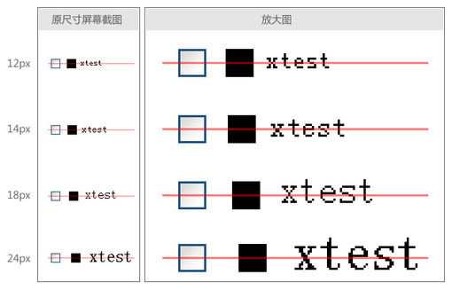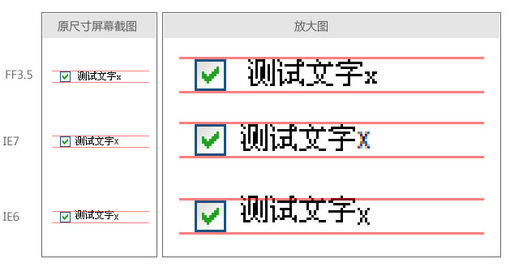事實(shí)證明,F(xiàn)F3.5對(duì)于復(fù)選框和圖片的垂直對(duì)齊方式是采用同樣的規(guī)則進(jìn)行渲染的,即將復(fù)選框當(dāng)作一個(gè)正方形的圖片(IE不是)。按照wheatlee“middle的時(shí)候,是該元素的中心對(duì)齊周?chē)氐闹行?rdquo;的觀點(diǎn),如果我在復(fù)選框后面輸入英文字符,那么復(fù)選框的中心將與英文中小寫(xiě)字母x的中心對(duì)齊。經(jīng)測(cè)試,F(xiàn)F3.5下面基本上是這樣的(在一些字號(hào)的時(shí)候會(huì)有一定的誤差,比如,如果字體高度是偶數(shù),那么這個(gè)中心點(diǎn)有時(shí)在一般偏上1px,有時(shí)在一半偏下1px)。如圖: