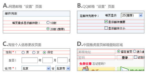 于是,嘗試去掉radio的外邊距,刷新后顯示正常。(其實(shí)多選框checkbox也是有外邊距的,只是它的外邊距四個(gè)方向都有,并且相等,所以對(duì)于垂直對(duì)齊沒(méi)有影響。)下圖是一些常用表單元素的最終顯示效果以及最終代碼,大家可以用不同瀏覽器看一下實(shí)際的效果(注:由于演示使用的12px的中文實(shí)際只有11px高,而 IE下文本框等元素的高度是22px,一個(gè)是奇數(shù),一個(gè)是偶數(shù),所以這些部分在IE中是無(wú)論如何也對(duì)不齊的,差1px。如果手動(dòng)控制文本框高度為奇數(shù),或者將文字設(shè)置成為偶數(shù)的高度,則顯示正常):