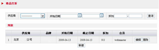 上圖是商品打折的添加,在這個(gè)頁(yè)面的上部是對(duì)商品打折的查詢(xún),可以根據(jù)供應(yīng)商、開(kāi)始日期、折扣進(jìn)行查詢(xún),下面是添加后的列表,可以對(duì)添加好的進(jìn)行修改編輯和刪除,點(diǎn)擊下面的”新建”,可以看到下面圖片: