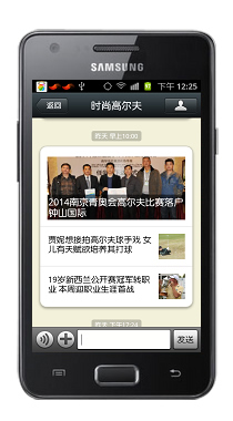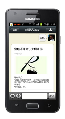 當(dāng)用戶對(duì)時(shí)尚高爾夫公眾平臺(tái)詢問(wèn)金色時(shí),系統(tǒng)會(huì)從服務(wù)器數(shù)據(jù)庫(kù)找詢關(guān)于金色的所有信息,并組合成為圖文并茂的信息回復(fù)自動(dòng)發(fā)送給用戶。