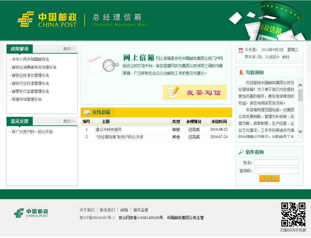 上線網(wǎng)站包括:“中國郵政官網(wǎng)”、“ChinaPost(中國郵政英文網(wǎng))”、“中國郵政視頻網(wǎng)”、“中國郵政總經(jīng)理信箱”、“中國郵政報(bào)記者之家”、“中國郵政人力資源網(wǎng)”、“中國郵政報(bào)”、“中國郵政集團(tuán)工會(huì)網(wǎng)”。