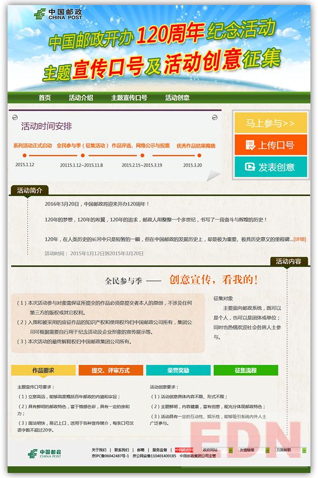 中國郵政中國郵政開辦120周年活動主題及活動方案征集活動啟動,怡康開發(fā)制作團隊,在段時間內(nèi)完成從設(shè)計,功能開發(fā),頁面承現(xiàn),并第一時間把專題上線。工作效率及負責的態(tài)度受客戶好評。
