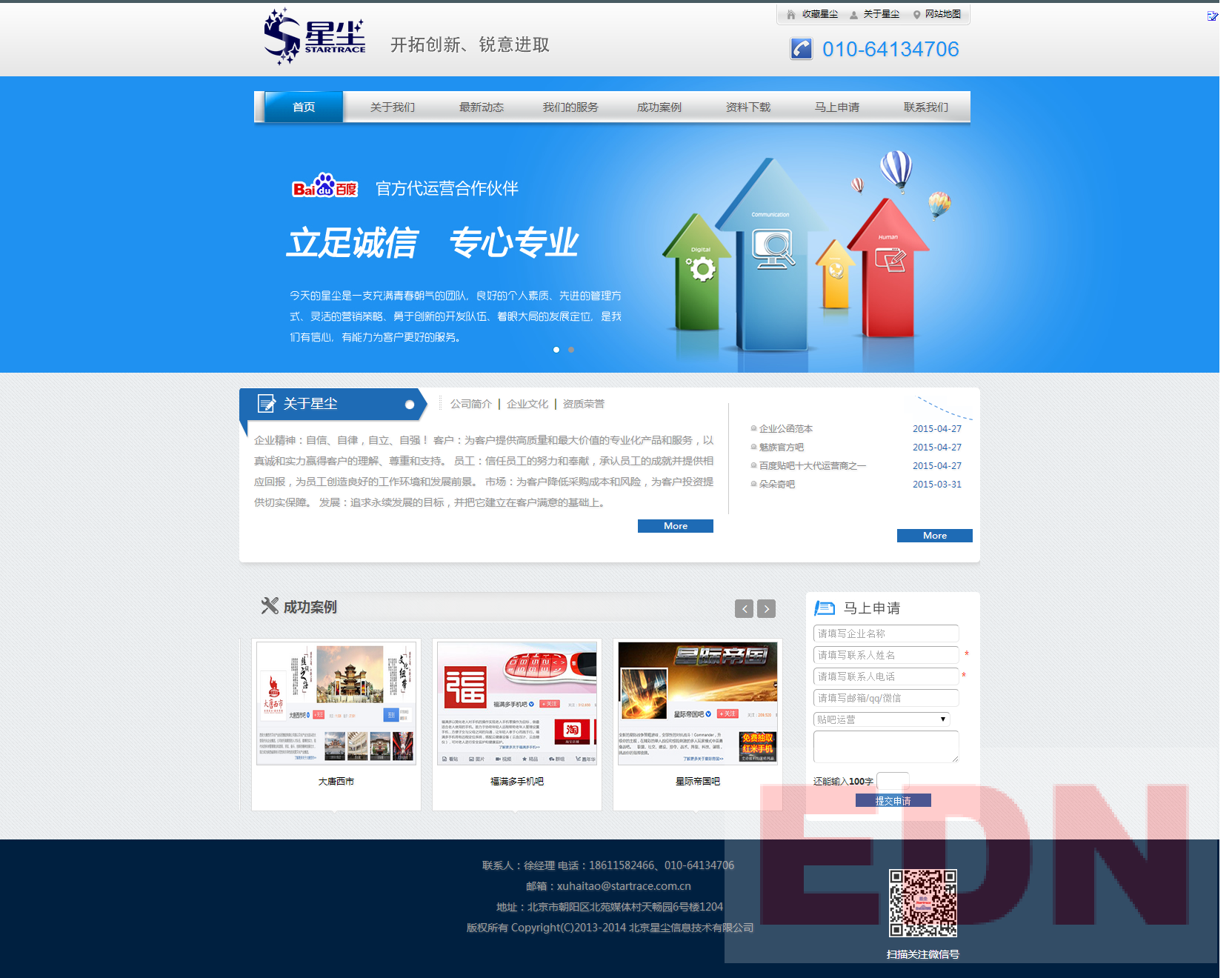 北京星塵信息技術有限公司是一家集企業(yè)網絡營銷推廣;設計、制作、代理發(fā)布廣告;電腦圖文設計、制作以及為企業(yè)提供技術咨詢和服務為一體的服務型企業(yè)。在公司總體戰(zhàn)略發(fā)展目標指引下,發(fā)揮整體優(yōu)勢,發(fā)展特色經營,前期已在北京建立了一套完整的市場營銷網絡。公司擁有自己一套特有的銷售網絡,現有客戶200余家。主要服務企業(yè)有國家工業(yè)和信息化部下屬各大科研機構...