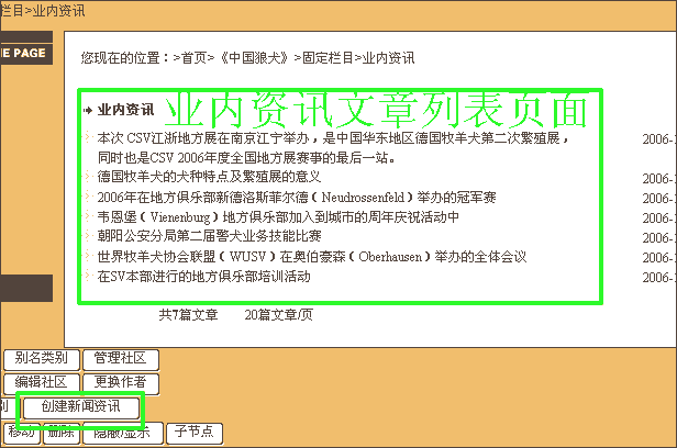 3.從這個頁面出發(fā),繼續(xù)尋找,來到我們要添加文章的界面。例如,我們要在“業(yè)內(nèi)資訊”欄目下添加新文章,那么就要進入到“業(yè)內(nèi)資訊”文章列表所在頁面。在頁面下方會見到同上圖一樣的一群按鈕。注意:一定要進入真正的列表頁面,而不是首頁或其父類頁面。列表頁才是我們的“操作車間”。對于這些按鈕不要眼花,我們常用到的僅僅是其中兩個而已。點擊“創(chuàng)建新聞資訊”按鈕,進入編輯頁面:
