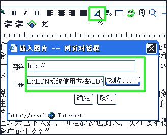 7.接著插入圖片。先用鼠標點擊在編輯器內(nèi)需要插入圖片的位置,點擊上面的插入圖片標記,然后彈出“插入圖片”對話框??梢园丫W(wǎng)絡上的圖片地址填入;也可以雙擊“瀏覽”,從本機上傳一張圖片。我上傳了本地一張圖片。最后點“確定”: