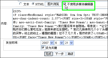 11.在勾選“不使用多媒體編輯器”時,編輯狀態(tài)就是有代碼的樣子,這種狀態(tài)適合有一些HEML代碼基礎的用戶來使用,它的好處就是定位準確、垃圾代碼少、占用資源小。使用方法就跟前面一樣,把標題、作者添好,把代碼編寫好,點擊完成即可提交。