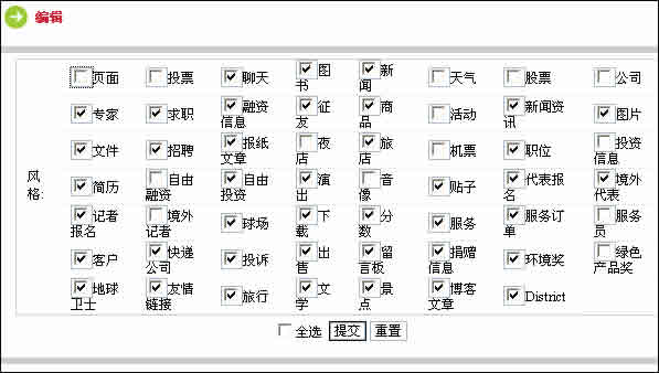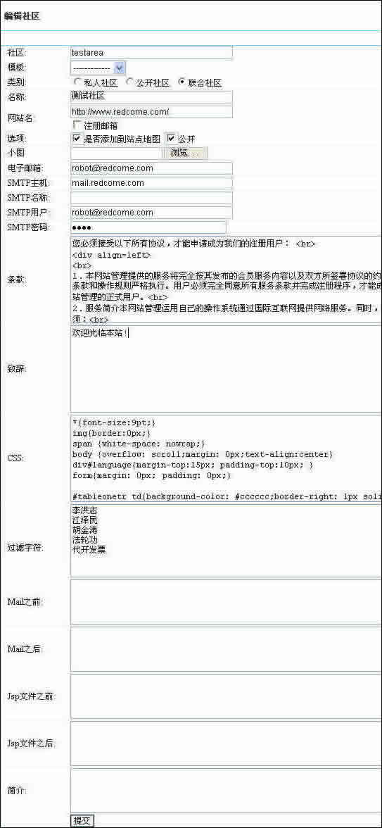 3. 社區(qū)編輯功能:可以修改社區(qū)名稱、類型(私人社區(qū)為不公開社區(qū),只對特定用戶開放;公開社區(qū)可對任何人開放,無其他限制;聯(lián)合社區(qū)表明與其他社區(qū)有關(guān)聯(lián)。)、網(wǎng)站名、是否可以注冊電子郵箱、社區(qū)向用戶發(fā)送郵件的SMTP主機(jī)、SMTP用戶、密碼,用戶注冊條款、致辭、網(wǎng)站CSS風(fēng)格、過濾字符以及編輯屬性、招聘設(shè)置、博客設(shè)置、其他設(shè)置以及菜單管理。