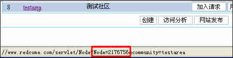 創(chuàng)建的社區(qū),可以在“組織的社區(qū)”頁面中的社區(qū)列表里看到。將鼠標(biāo)移動(dòng)到社區(qū)ID“testarea”上,可以看到狀態(tài)欄中出現(xiàn)了一行字母,其中包含了“Node=2176756”,“2176756”這個(gè)是該社區(qū)的節(jié)點(diǎn)號(hào),在網(wǎng)站發(fā)布的時(shí)候使用。