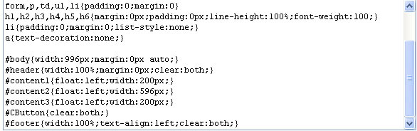我在總的CSS內(nèi)定義了#body寬996,標題、頁腳100%寬,內(nèi)容1、內(nèi)容2、內(nèi)容3分別為200、596和200都浮動居左,如下圖: