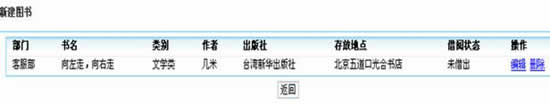 進(jìn)入上圖是根據(jù)提示進(jìn)行添加,提交后跳轉(zhuǎn)到圖四中,可以根據(jù)您的要求,來查詢您想看的書的具體信息,查詢出的的圖示如下(圖六):