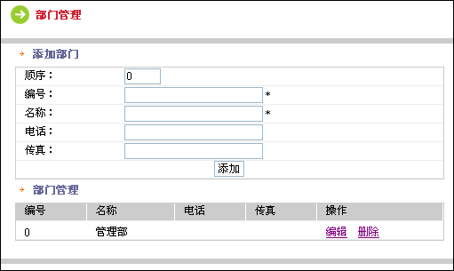 在添加部門表中填寫部門的編號(hào)、名稱等相關(guān)信息,點(diǎn)擊添加按鈕。