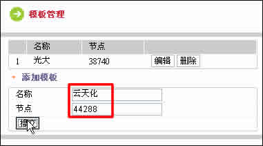 打開(kāi)“模板管理”頁(yè)面。名稱(chēng)填入模板名稱(chēng),節(jié)點(diǎn)就填定義為模板的社區(qū)節(jié)點(diǎn)號(hào)。添完以后,點(diǎn)“提交”,就完成了模板的定義。如圖所示:
