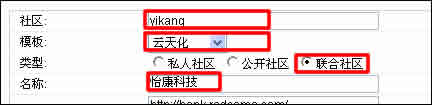 如圖所示,按照紅色方框提示,填寫(xiě)社區(qū)、模板、選擇類(lèi)型、填寫(xiě)名稱(chēng)。其他區(qū)域都不做改動(dòng)。注意:“社區(qū)”一定要填英文,不能填中文。