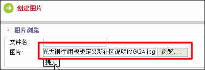 進(jìn)入編輯頁(yè)面。點(diǎn) “圖片瀏覽”,進(jìn)入“創(chuàng)建圖片”頁(yè)面。點(diǎn)“瀏覽”,把需要上傳的圖片瀏覽進(jìn)去。然后 “提交”。