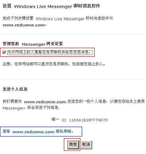 點擊“個人客服MSN配置”進入“設置 Windows Live Messenge即時消息控件”頁面;如圖: