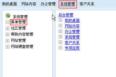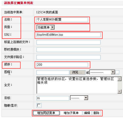 點擊右邊菜單列表中“我的桌面”,在 “菜單管理”界面按照下圖紅色方框所括的內容進行填充。注意:“類型”下拉列表中包括“文件夾”和“功能菜單”,其中,有子菜單的菜單名選擇文件夾,沒有子菜單的菜單名選擇功能菜單;“URI”是實現(xiàn)“個人客服MSN配置”的代碼頁面,填入該代碼頁面的地址;“順序”里面填數(shù)字,數(shù)字越小越排在前面。如下圖: