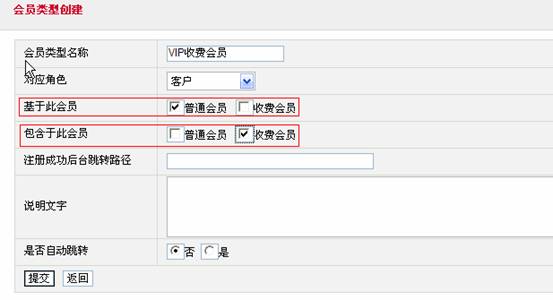 我們讓它基于普通會(huì)員,包含于收費(fèi)會(huì)員,包含于的意思就是說此新建會(huì)員類型包含所選擇的會(huì)員類型的所有功能。