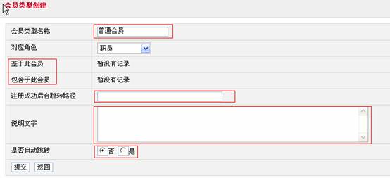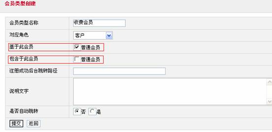 會(huì)員類型名稱可以任意填寫,在這里我們填寫的是普通會(huì)員,可以設(shè)置該會(huì)員擁有的角色,設(shè)置注冊(cè)成功是否跳轉(zhuǎn)和跳轉(zhuǎn)的路徑以及說明文字,另外還有基于此會(huì)員和包含于此會(huì)員的選擇,因?yàn)槠胀〞?huì)員是我們創(chuàng)建的第一個(gè)會(huì)員類型所有此兩項(xiàng)都沒有記錄。