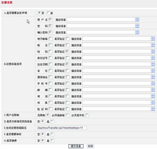 例如:某些網(wǎng)站的收費(fèi)會(huì)員也是企業(yè)會(huì)員,他們除了填寫一些基本的注冊(cè)信息外,還需要填寫一份他們自己企業(yè)的注冊(cè)信息,這是我們?cè)谠O(shè)定這類會(huì)員注冊(cè)信息的時(shí)候,在是否關(guān)聯(lián)填寫類別信息后邊選擇是,要關(guān)聯(lián)一個(gè)公司的注冊(cè)信息表單。