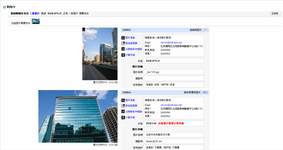 購物車中的圖片只有全部計算完價格還可以點擊右上角的 按鈕進(jìn)行結(jié)賬,結(jié)賬后管理員進(jìn)行財務(wù)確認(rèn)后方能生成訂單并提供圖片的下載連接,可至3.1.2訂單和下載進(jìn)行查看,購物車具體操作和說明如下: