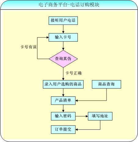 電子商務(wù)平臺-電話訂購模塊的功能與網(wǎng)上購物的功能有一定的差別,該功能目前只針對會(huì)員卡。顧客打進(jìn)電話,呼叫坐席在我們的電話訂購功能里面輸入顧客的會(huì)員卡號、所購商品、郵寄地址。當(dāng)訂單提交成功以后,系統(tǒng)數(shù)據(jù)庫中就會(huì)相應(yīng)地扣除用戶所購商品的金額,當(dāng)貨物送到以后,用戶需用會(huì)員卡在我們的手持終端刷卡,從卡中扣除相應(yīng)的錢數(shù),此時(shí),一次完整的電話訂購交易結(jié)束。