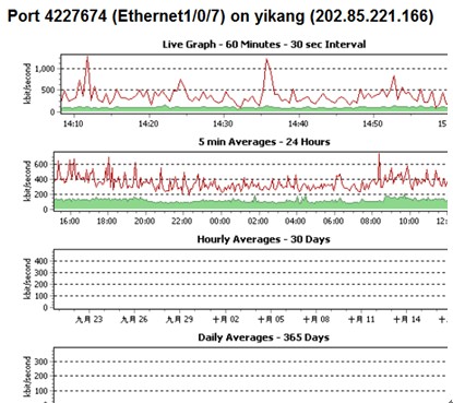 點(diǎn)擊一個端口項前面的+號可以看到最近一個小時的流量圖(紅色線條為服務(wù)器輸出流量,綠色為輸入流量) (端口Ethernet1/1/1、Ethernet1/1/2 為總流量 輸出線條顏色正好相反)