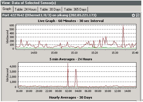 直接點(diǎn)擊一個IP對應(yīng)的端口項,可以看到改IP端口的流量圖(包括最近1小時、一天、一個月、一年的流量圖示)