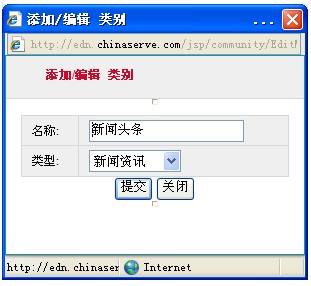 4、點(diǎn)擊創(chuàng)建按鈕彈出新的窗口,在新的窗口中輸入類別名稱及選擇類別的類型,點(diǎn)擊提交自定義文章分類就建好了;在自定義文章分類建好的同時(shí)系統(tǒng)會(huì)自動(dòng)在網(wǎng)站的列舉選項(xiàng)中和文章頻道選項(xiàng)中添加自定義文章的分類;自定義文章分類創(chuàng)建頁(yè)面如下圖所示: