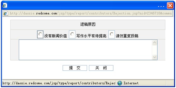 退稿:文件不符合要求及規(guī)定,將投稿退回給會(huì)員;點(diǎn)擊退稿彈出窗口可以寫退稿原因;如下圖: