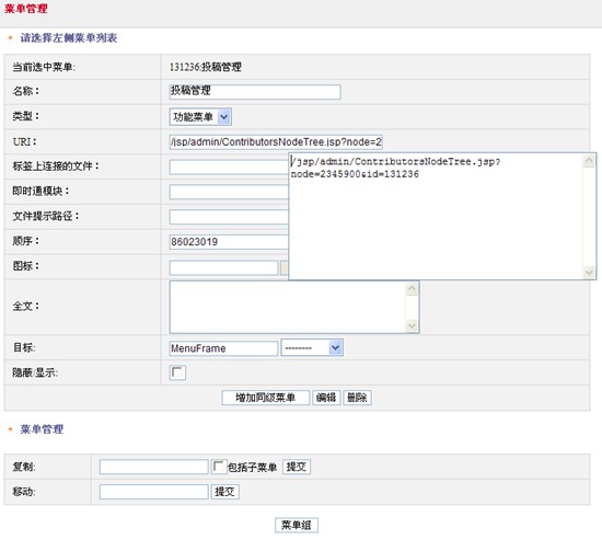 進(jìn)入網(wǎng)站后臺(tái)管理,點(diǎn)擊系統(tǒng)管理創(chuàng)建投稿管理的功能欄目菜單;在創(chuàng)建功能菜單的時(shí)候在目標(biāo)處填寫:MenuFrame,讓投稿管理的功能菜單在頁面的左側(cè)顯示;創(chuàng)建投稿功能如下圖所示: