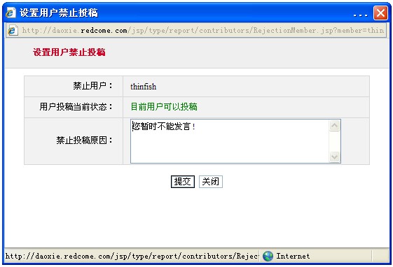 :禁止會(huì)員投稿,如設(shè)置之后此會(huì)員將不能投稿;點(diǎn)擊按鈕彈出窗口可以查看會(huì)員是否被禁止投稿;如要禁止點(diǎn)擊提交即可;在次點(diǎn)擊按鈕即解開禁止投稿;