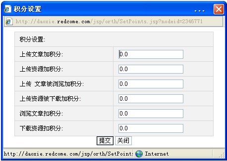 積分設(shè)置:針對(duì)于已稿件給會(huì)員的加、減積分設(shè)置。彈出窗口進(jìn)行積分設(shè)置,如下圖所示: