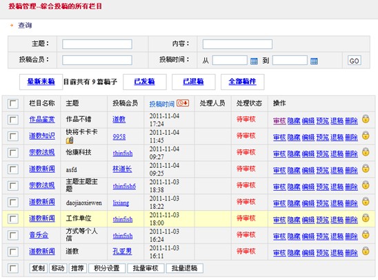 點(diǎn)擊投稿管理進(jìn)入投稿管理頁面,在頁面的左側(cè)會(huì)自動(dòng)提取投稿的欄目菜單,可以分別瀏覽各個(gè)欄目下的投稿,然后進(jìn)行管理,如下圖所示: