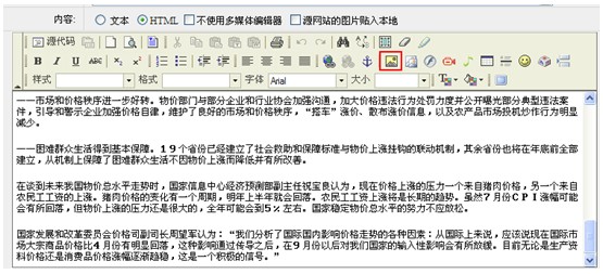 內(nèi)容圖片的上傳是在上傳欄目?jī)?nèi)容時(shí)在編輯器里上傳的圖片,例如:上傳新聞時(shí)新聞內(nèi)容中含有圖片,該圖片是在新聞上傳頁(yè)面中的編輯器里完成的,如圖: 如想在該新聞內(nèi)容中添加圖片,點(diǎn)擊編輯器中的“圖片”按鈕上傳圖片即可,圖片上傳詳細(xì)見(jiàn)7.1節(jié)中“內(nèi)容的前臺(tái)管理”下編輯器