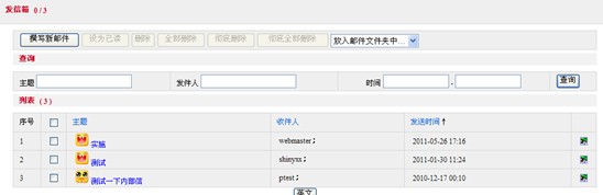 點(diǎn)擊“發(fā)件箱”,進(jìn)入“消息”頁面。該頁面由“郵件列表”和 “創(chuàng)建信件”兩部分組成。“郵件列表”列出的是曾經(jīng)發(fā)過的郵件,每發(fā)一封郵件,系統(tǒng)都會自動備份到“發(fā)信箱”中。發(fā)件箱消息”頁面如下圖所示:
