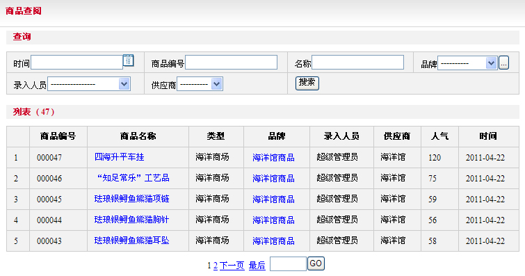 打開商品管理菜單>商品查閱 進入商品查閱頁面用戶可以看到一個商品列表,其列表不可以對商品進行創(chuàng)建、修改及刪除,只可以查詢及瀏覽;可以查看商品編號、商品名稱、商品類型、商品品牌、錄入人員、供應商及商品的瀏覽次數(shù)和商品上傳時間;商品查閱頁面如下圖: